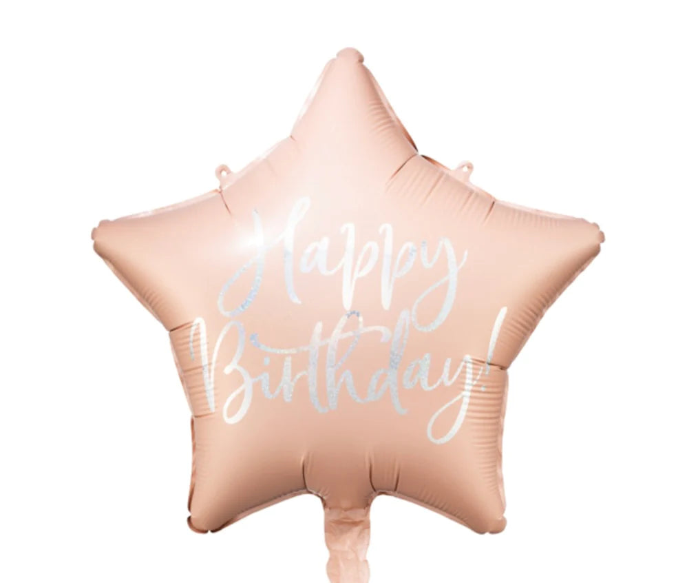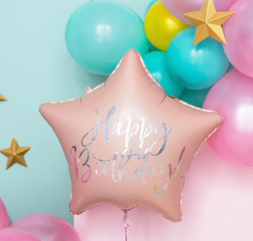 Glossy foil balloon in shape of star in light powder pink colour with gold metallic inscription Happy Birthday, size before inflation approx.