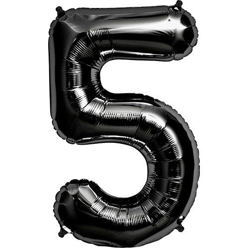 Metallic foil balloon number 5 in black, can be inflated with air or helium.