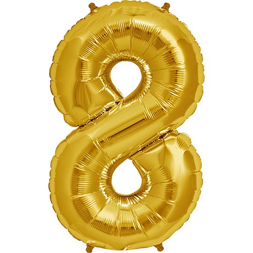Metallic foil balloon number 8 in gold, can be inflated with air or helium.