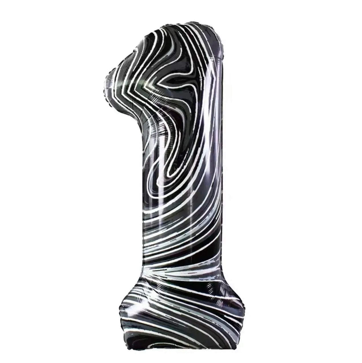 Foil balloon number 1 in marble colour, can be inflated with air or helium.