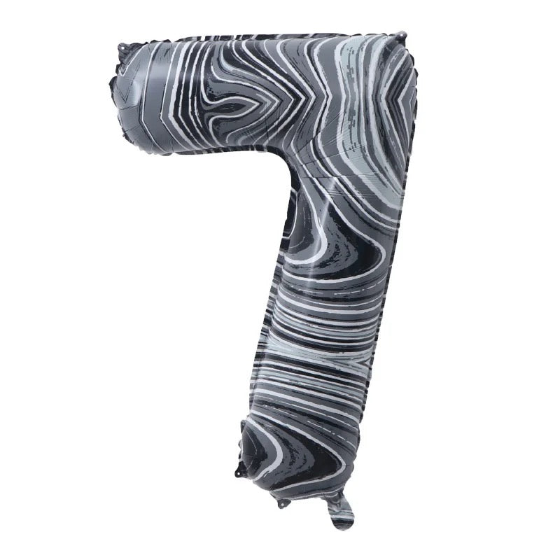 Foil balloon number 7 in marble colour, can be inflated with air or helium.