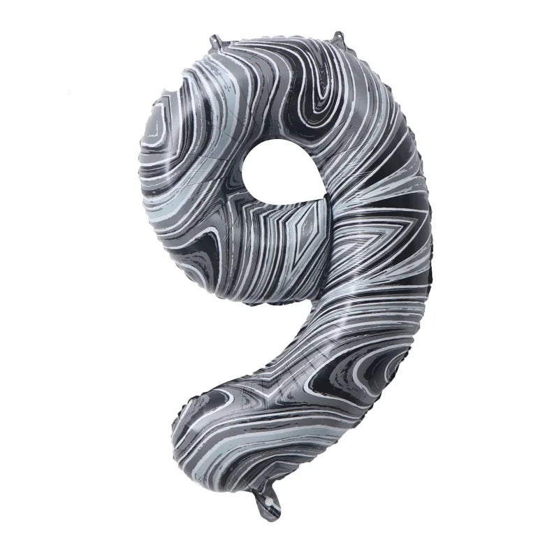Foil balloon number 9 in marble colour, can be inflated with air or helium.