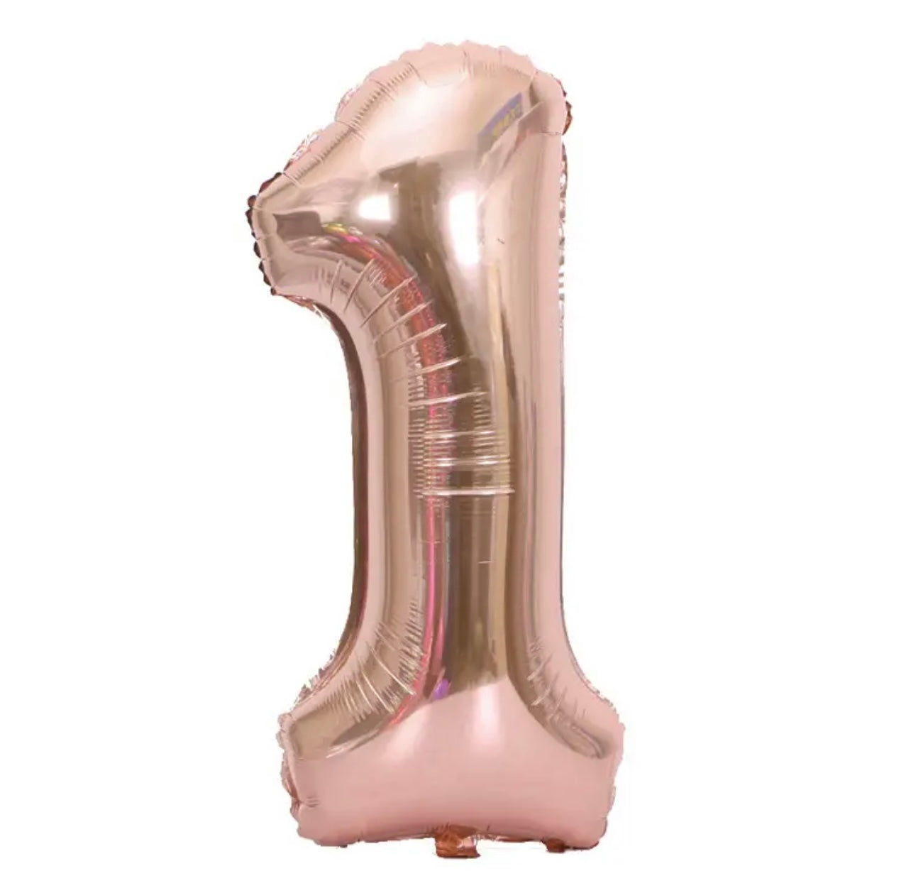 Metallic foil balloon number 1 in rose gold, can be inflated with air or helium.