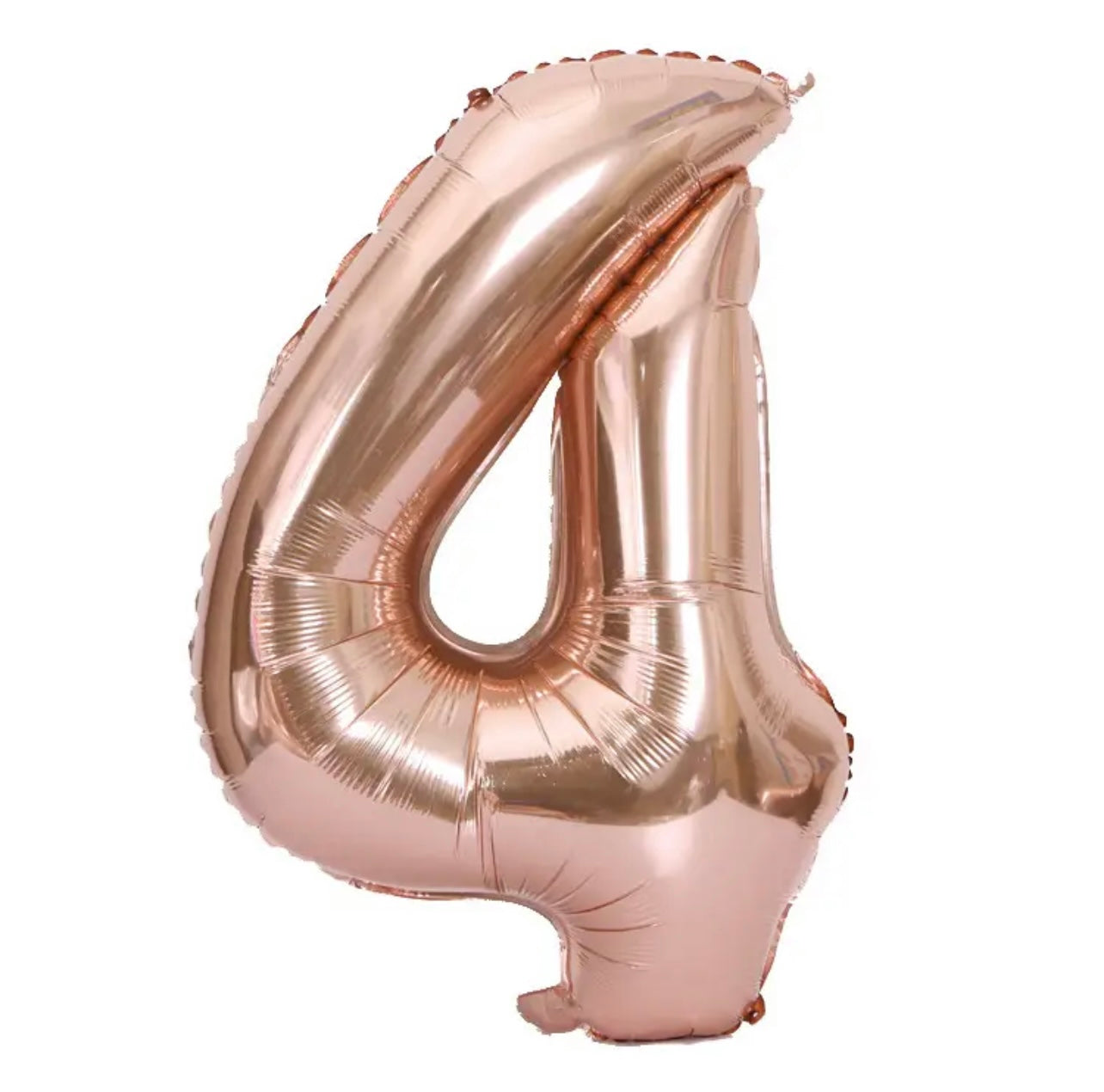 Metallic foil balloon number 4 in rose gold, can be inflated with air or helium.
