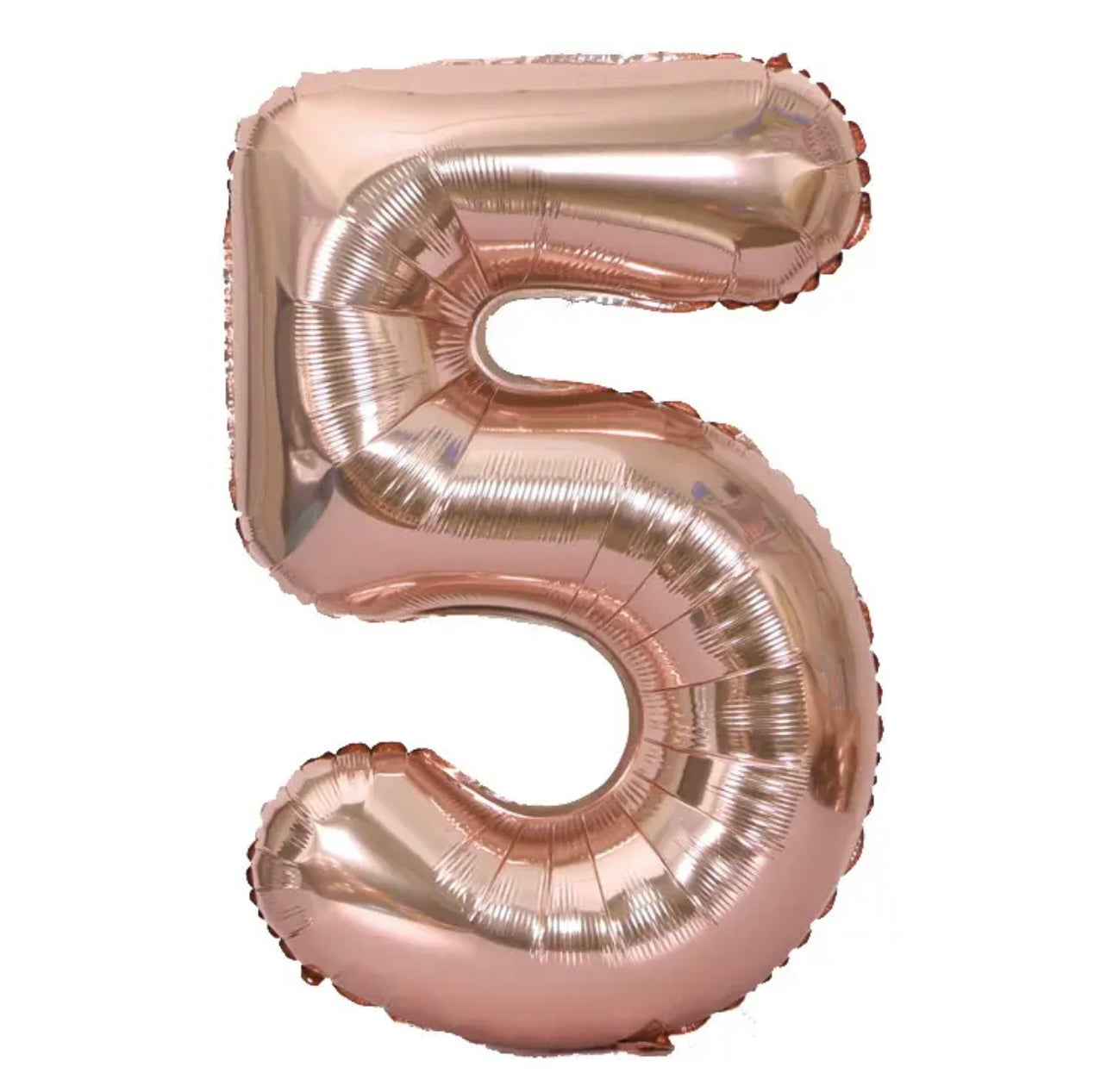 Metallic foil balloon number 5 in rose gold, can be inflated with air or helium.