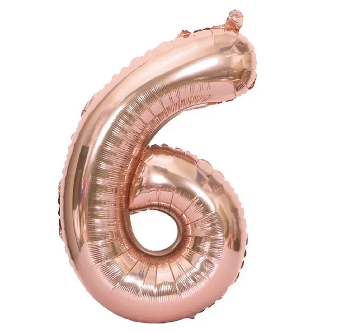 Metallic foil balloon number 6 in rose gold, can be inflated with air or helium.