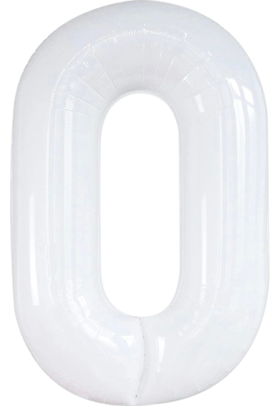 Metallic foil balloon number 0 in white, can be inflated with air or helium.