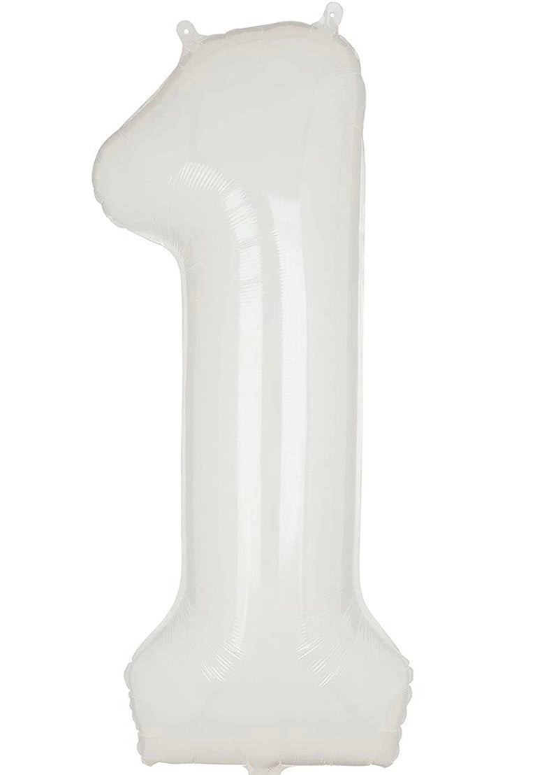 Metallic foil balloon number 1 in white, can be inflated with air or helium.