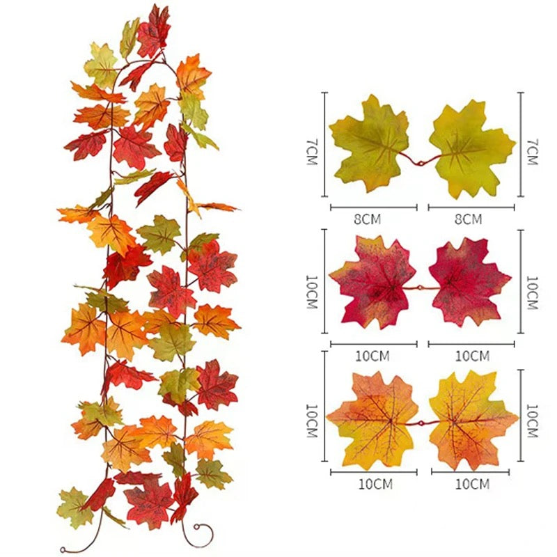 Package includes: 2pcs artificial maple leaves vines, each of garlands 5.7ft (1.75m) long, 36 pairs leaves, total length: 11.4ft (3.5m).
