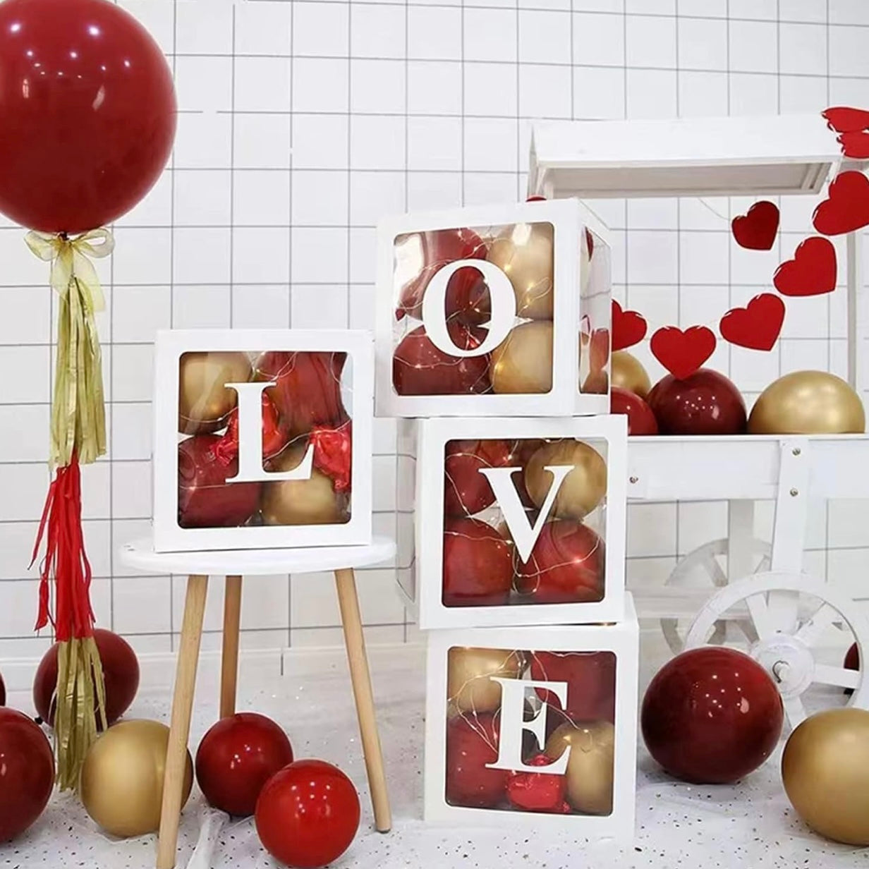 - 4PCS BALLOON BOX- 4PCS 11.8"×11.8"×11.8" white baby birthday clear boxes with 4pcs white letter spells 'LOVE'. Perfect for gender reveal backdrop boy or girl decorations, gender reveal party supplies, bridal showers, gender neutral baby shower decorations